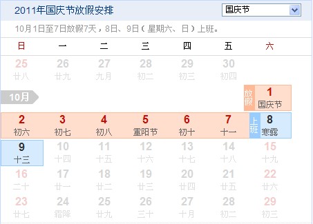 國慶節(jié):10月1日至7日放假調(diào)休,共7天。10月8日(星期六)、10月9日(星期天)上班。